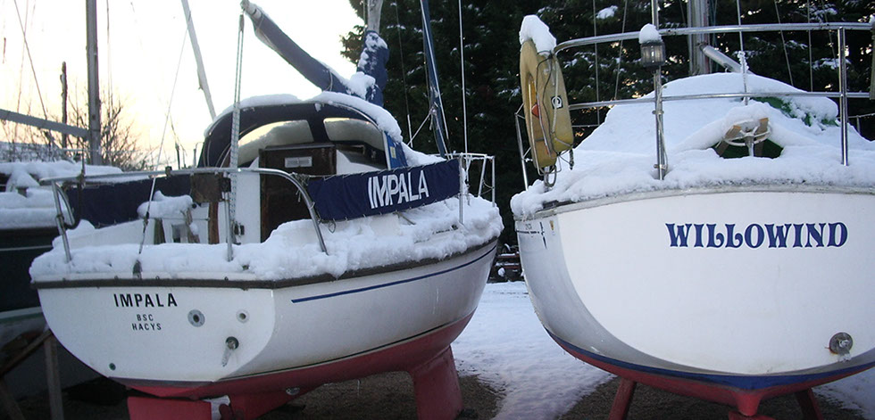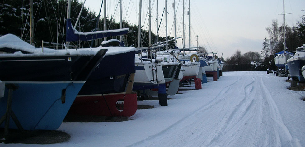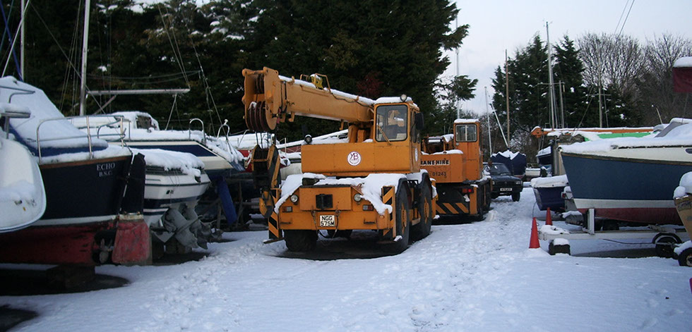 A wintery scene in the boatyard, showing the old cranes prior to upgrading to the new Kato crane