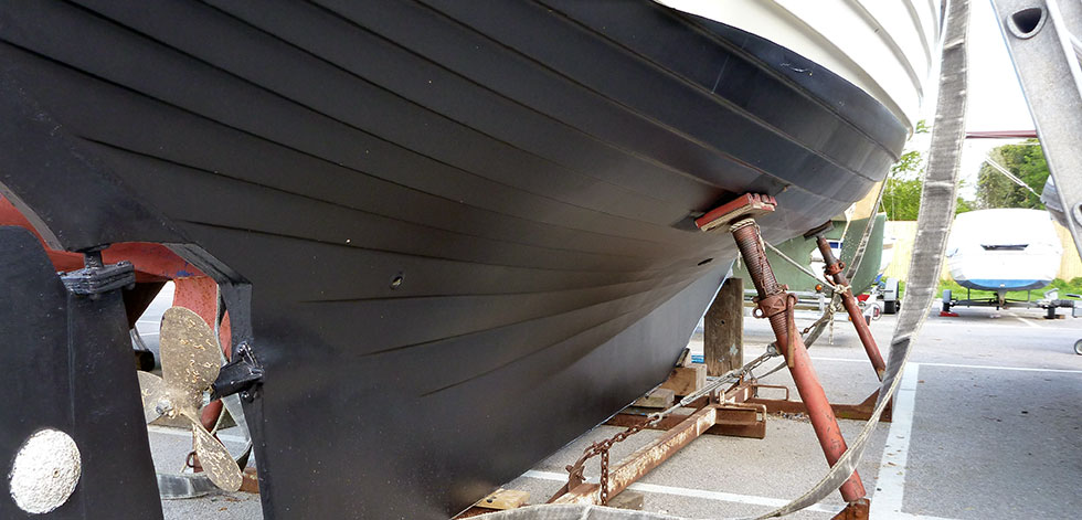Freshly antifouled and in crane slings ready to be moved to trailer for launching
