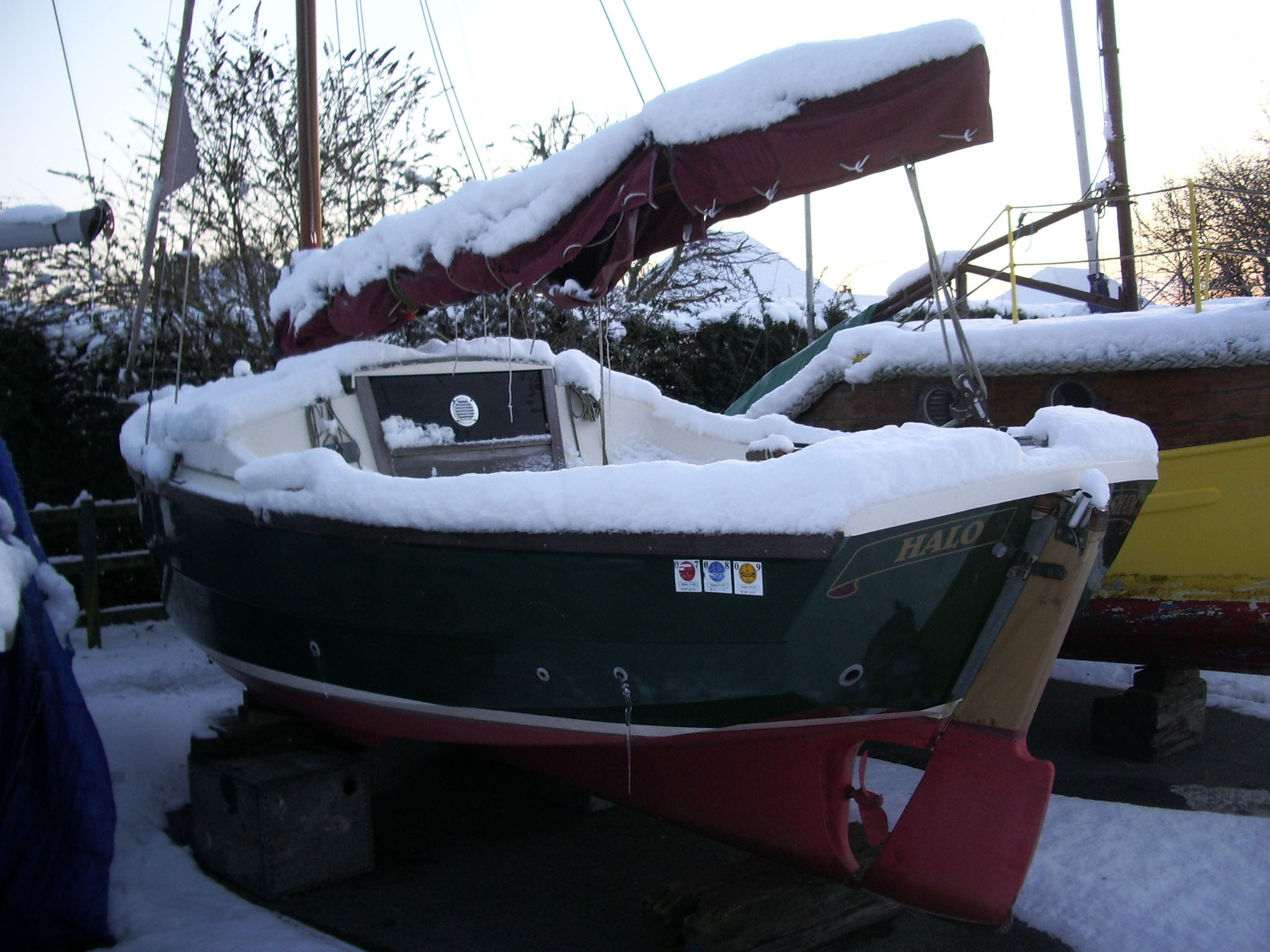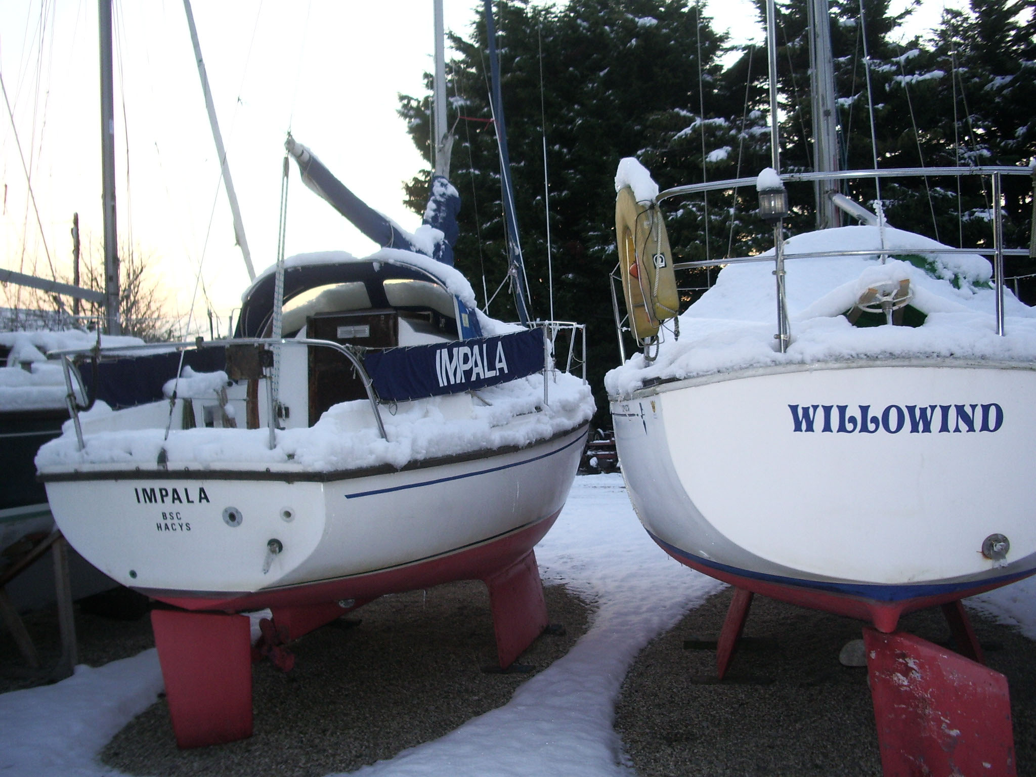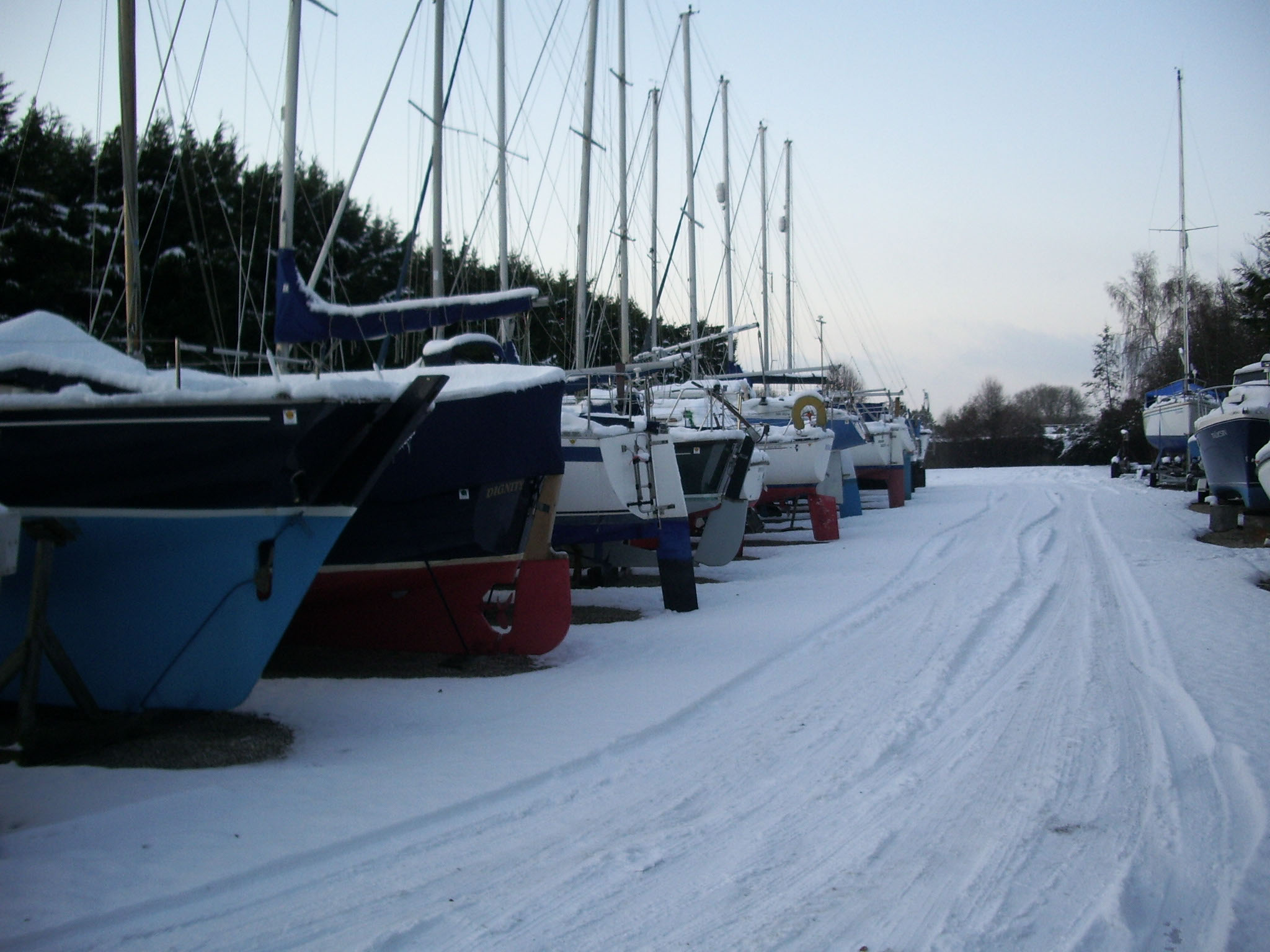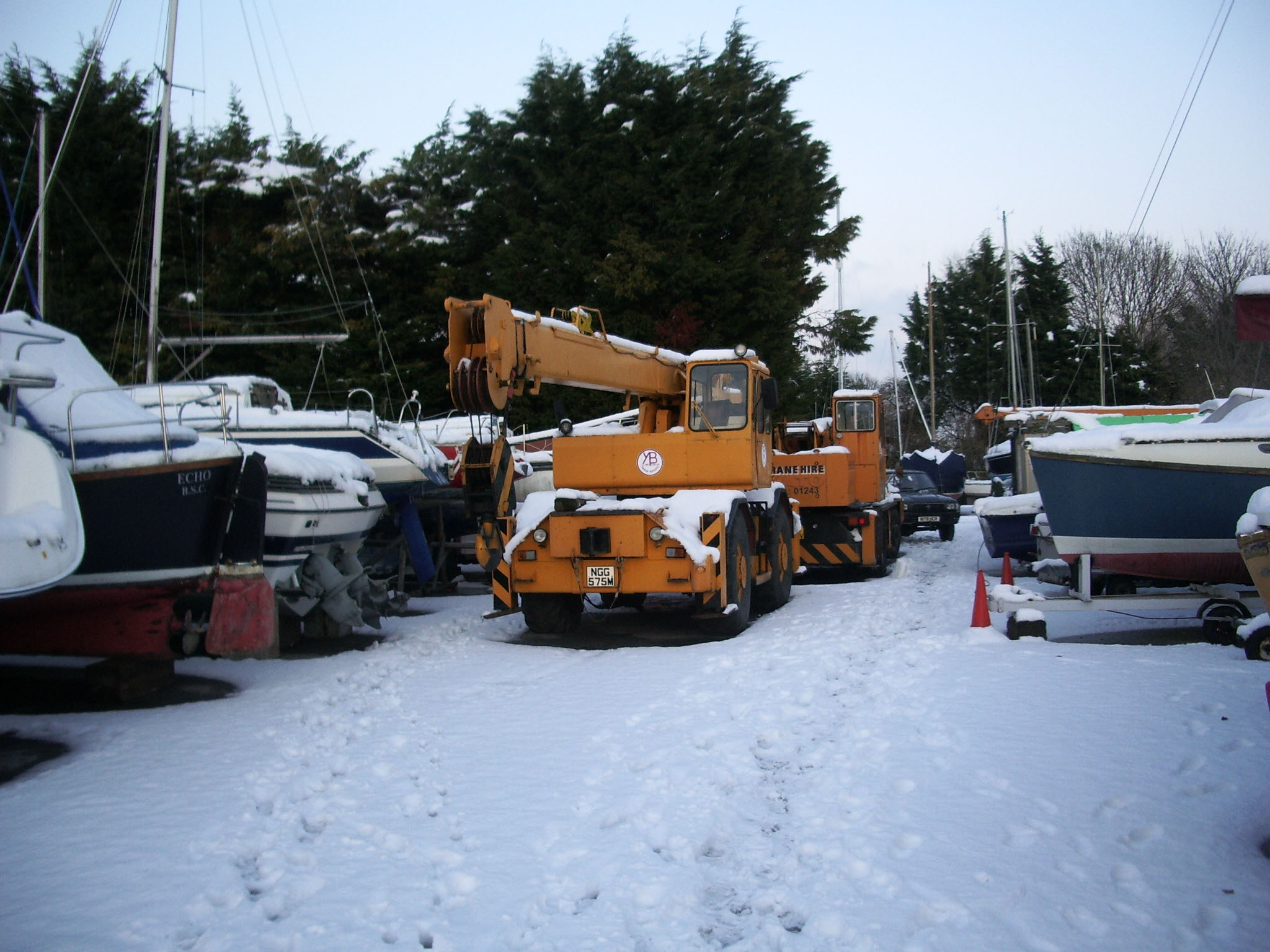 A wintery scene in the boatyard, showing the old cranes prior to upgrading to the new Kato crane